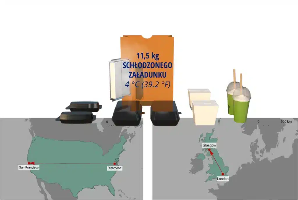 Ocena obejmuje różne scenariusze transportu, w tym transport mrożonek i świeżej żywności, trasy 72-godzinne i 24-godzinne w Stanach Zjednoczonych oraz trasy 48-godzinne i 24-godzinne w Wielkiej Brytanii. Jako pojemniki do transportu suchego lodu uwzględniono zarówno styropian, jak i ekologiczne kartony. Wyniki są następujące: