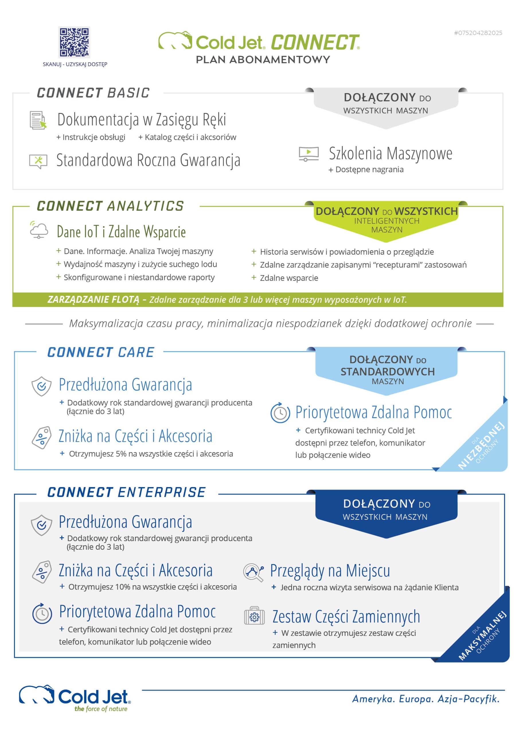 Aby zapewnić jak najbardziej wydajną pracę maszyny, platforma Cold Jet CONNECT oferuje szybki dostęp do dokumentacji maszyny z dowolnego smartfona, tabletu lub komputera. Wystarczy zeskanować kod QR na urządzeniu, aby uzyskać dostęp do: