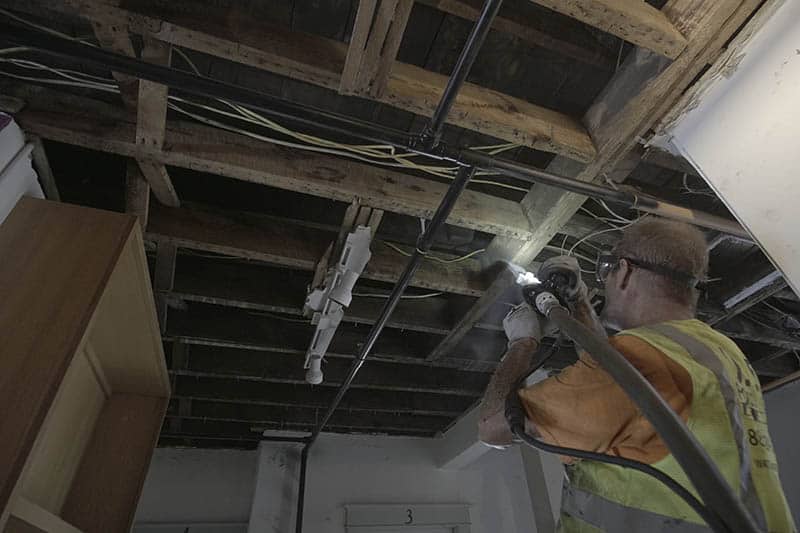 Con la sabbiatura criogenica si può accedere e pulire zone difficili da raggiungere, come negli angoli delle travature, intorno a chiodi, cavi e tubazioni, senza danneggiare la superficie. Inoltre il processo elimina o riduce notevolmente l’odore generato dai danni da incendio, fumo e muffa.